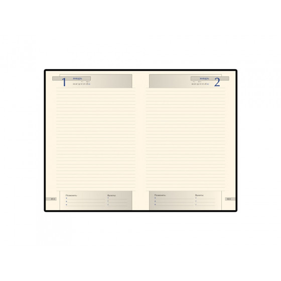 В ежедневнике есть полезная справочная информация и телефонная книга, а также 416 страниц для записи идей, мыслей и составления рабочих планов. Для изготовления страниц используется качественный бежевый офсет повышенной плотности (70 г/кв м), которая производится японской фирмой "Daiwa" и подходит для всех видов чернил.