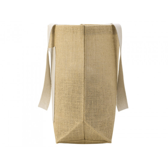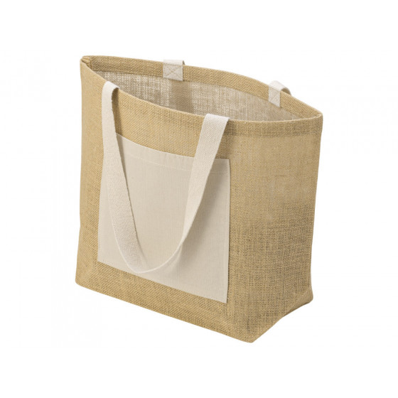 Сумка для покупок из ламинированного джута с большим хлопковым карманом спереди и широкими парусиновыми ручками из натурального хлопка. Благодаря расширенному дну сумка обладает большой вместимостью.