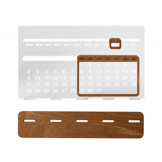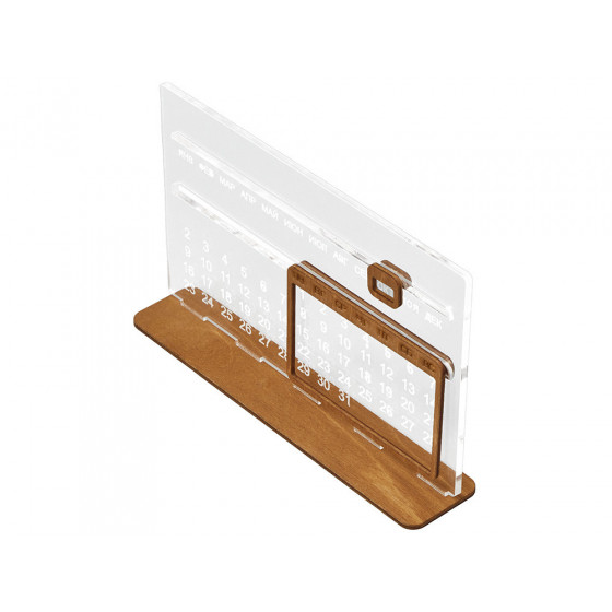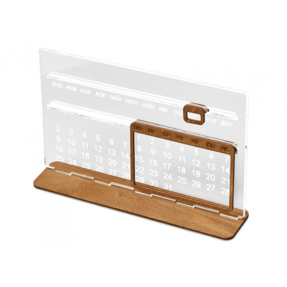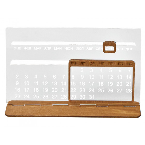 "Вечный" настольный календарь из бамбука, состоящий из одной подставки и четырех блоков с гравировкой.