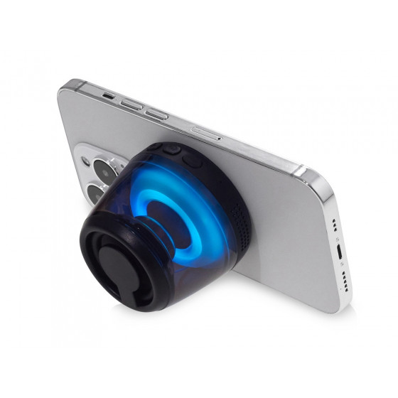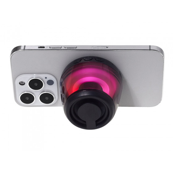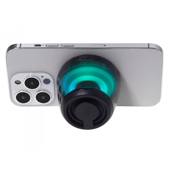 Современная магнитная Bluetooth-колонка колонка крепится к любому смартфону (iPhone -нативно, к другим -благодаря кольцу из комплекта). Это позволяет не только освободить руки, но и добавляет удобную подставку телефону. Динамик 40мм и мощностью 5 Вт обеспечивает сильное и насыщенное звучание даже в компактном корпусе. RGB подсветка имеет несколько режимов (переключение по трехразовому нажатию кнопки ВКЛ.). В комплекте кроме кольца – зарядный кабель USB-C и ремешок-ланъярд. Может принимать звонки и имеет разъем для micro SD карт памяти.