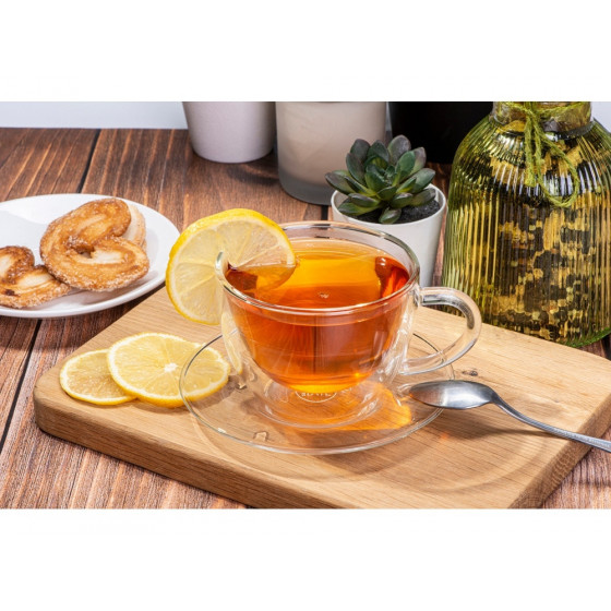 Изысканная чайная пара "Rio" – это гармоничное сочетание стиля и функциональности. Чашка с двойными стенками идеально подходит для наслаждения горячими и холодными напитками, а элегантное блюдце дополняет комплект, придавая ему особый шарм.