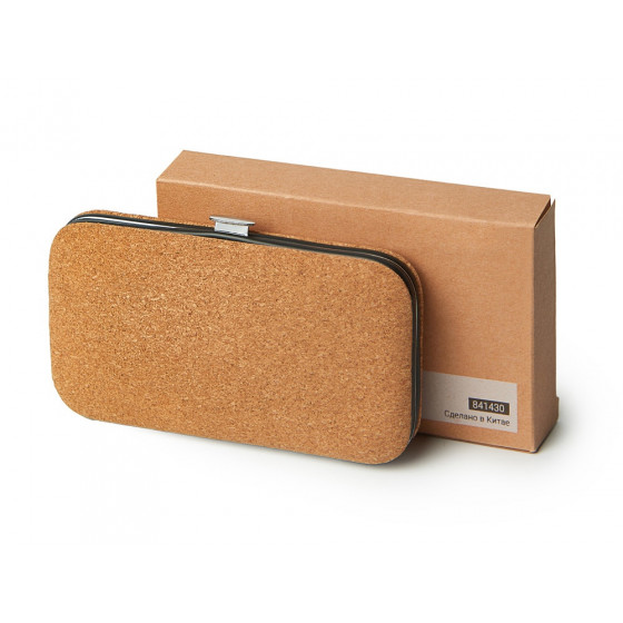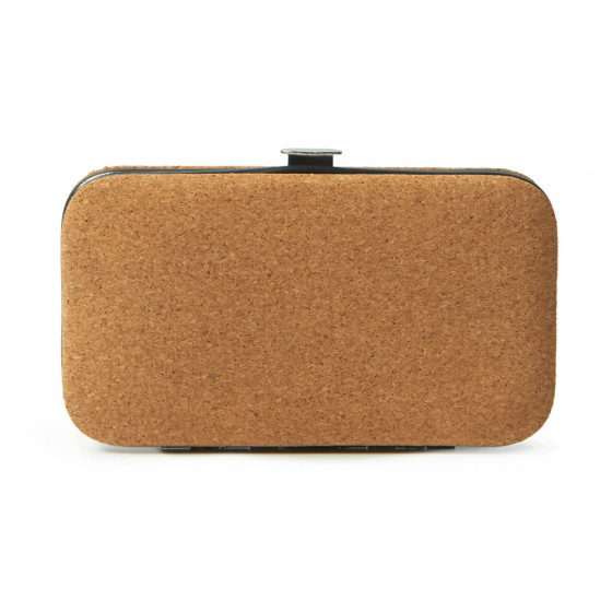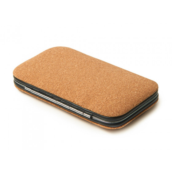 Маникюрный набор в чехле из пробки с застежкой на кнопу. Включает ножницы, пинцет, кусачки для ногтей, пилку и средство для удаления кутикулы из нержавеющей стали.