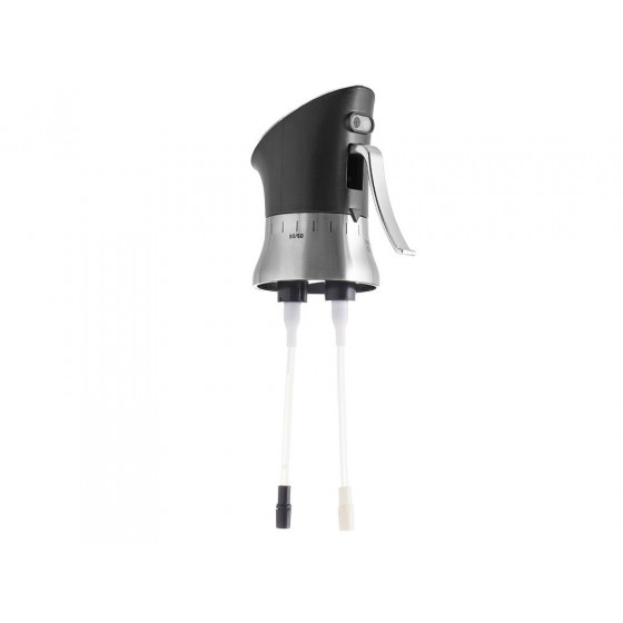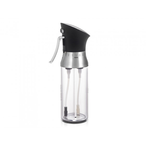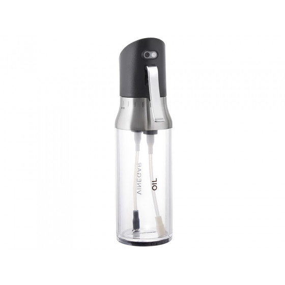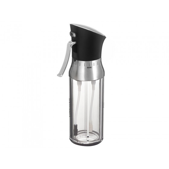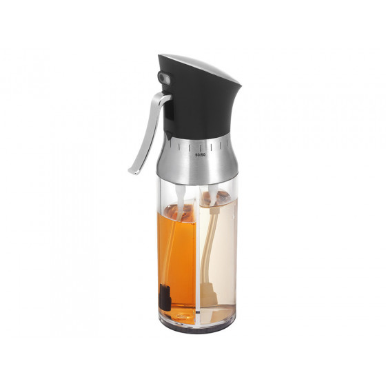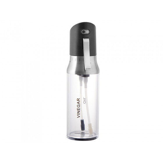 Двойная стеклянная емкость для масла и уксуса состоит из двух не сообщающихся сосудов с разными горлышками, затыкаемыми пробками.