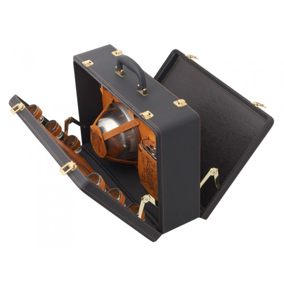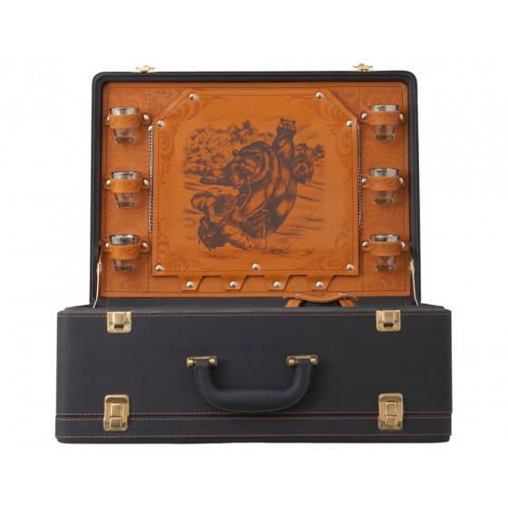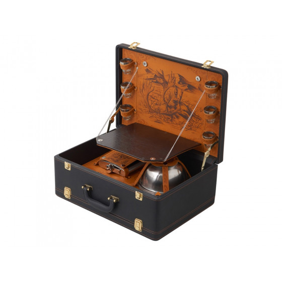 Шампура из нержавеющей стали с ручками из дерева венге и литьем в виде герба РФ. Дипломат из натуральной кожи с бархатной отделкой.
