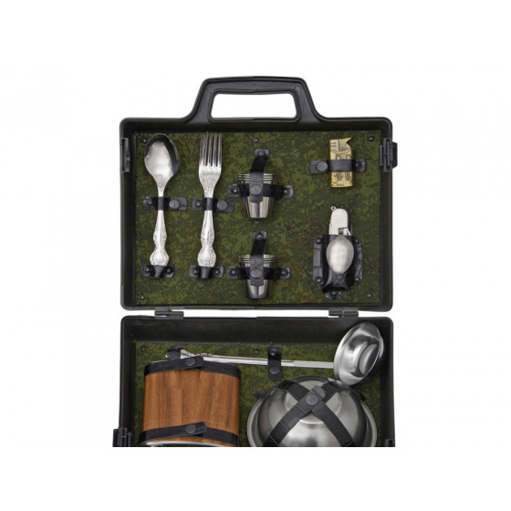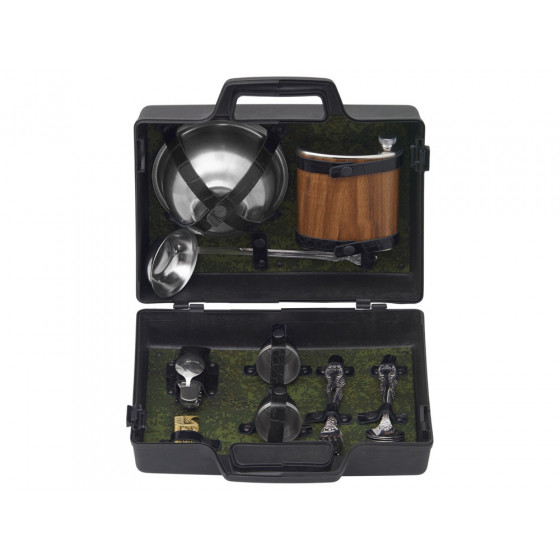 Все элементы набора выполнены из качественной нержавеющей стали, что обеспечивает долговечность и легкость в уходе. Упакованы в пластиковый кейс и надежно закреплены ремешками из натуральной кожи, что обеспечивает удобство транспортировки и сохранность содержимого.