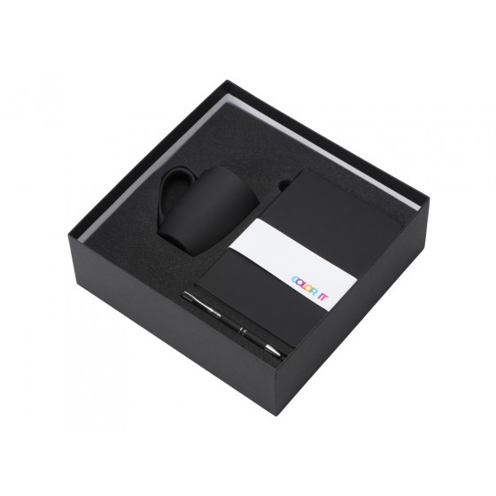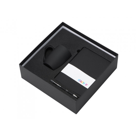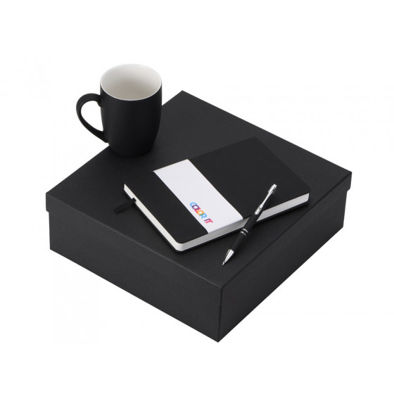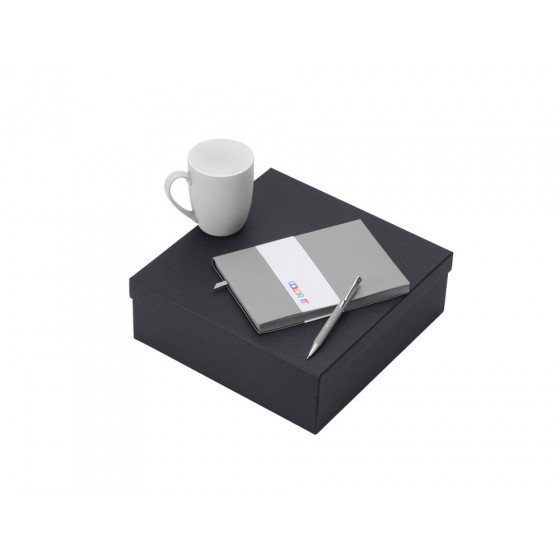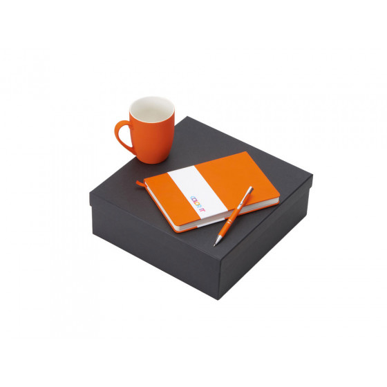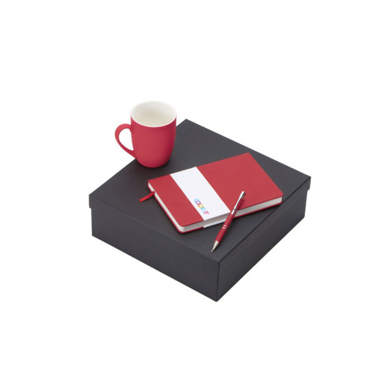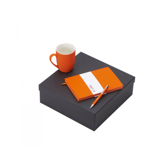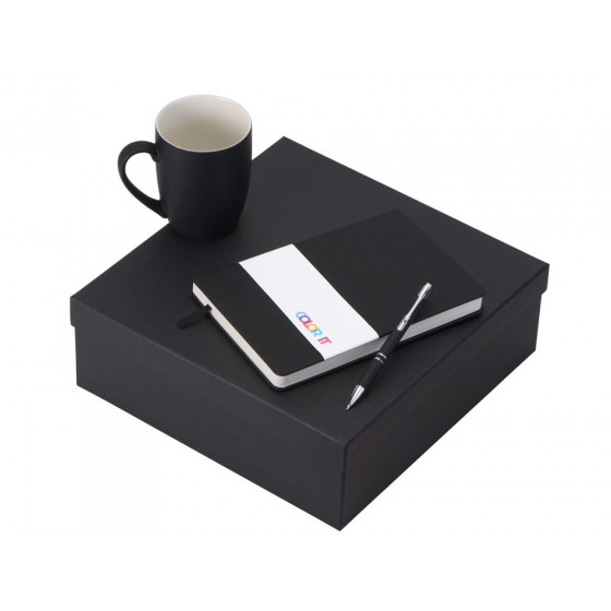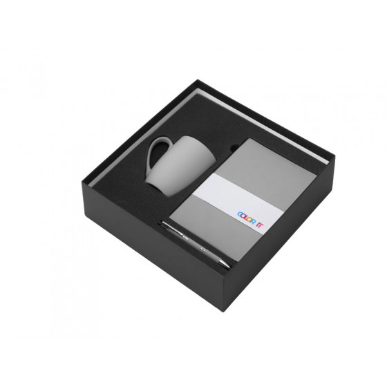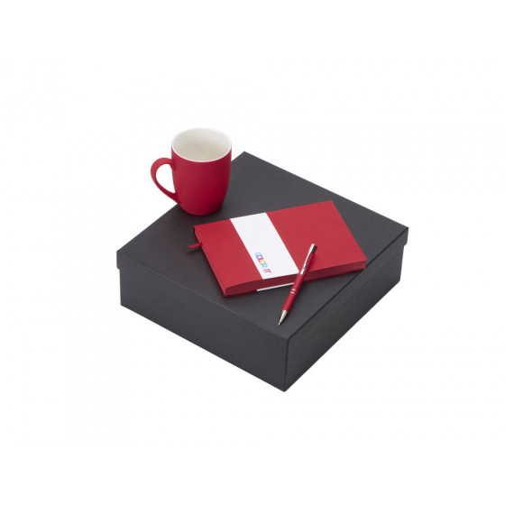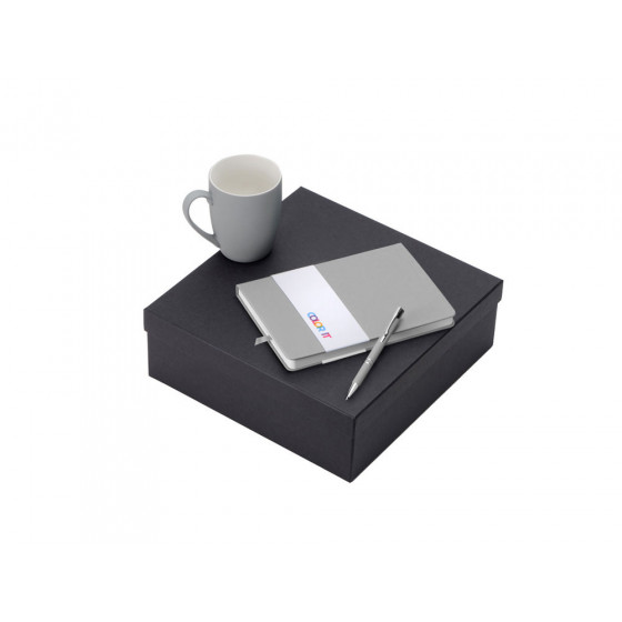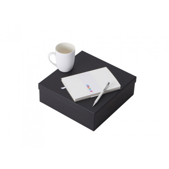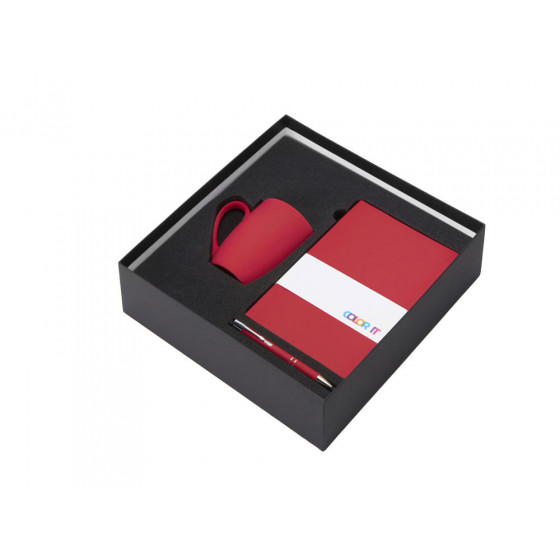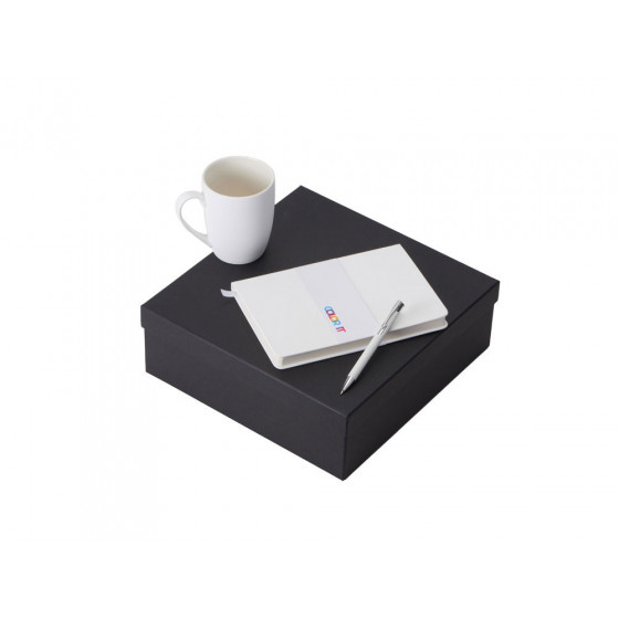 - блокнот - искусственная кожа с покрытием soft-touch, ручка - алюминий с покрытием soft-touch, кружка - фарфор с покрытием soft-touch, коробка - картон, гибкая