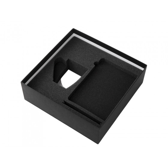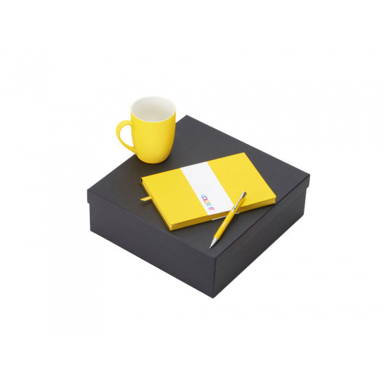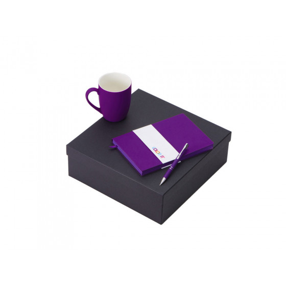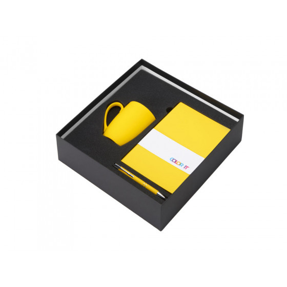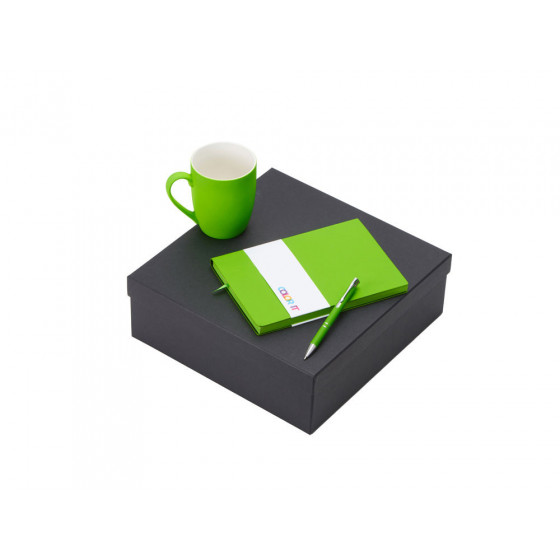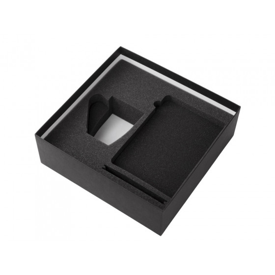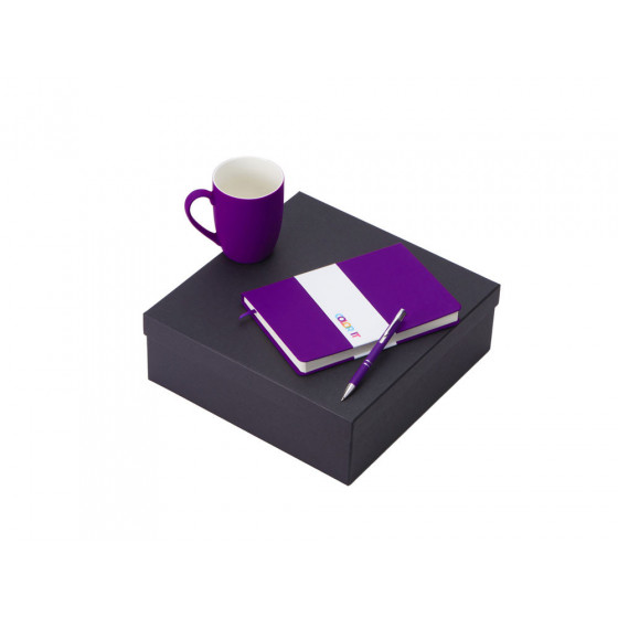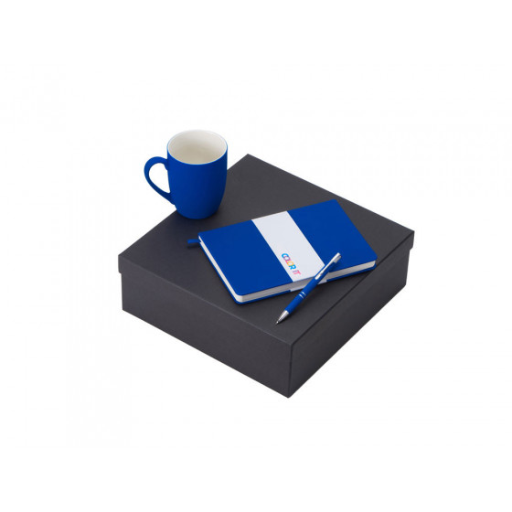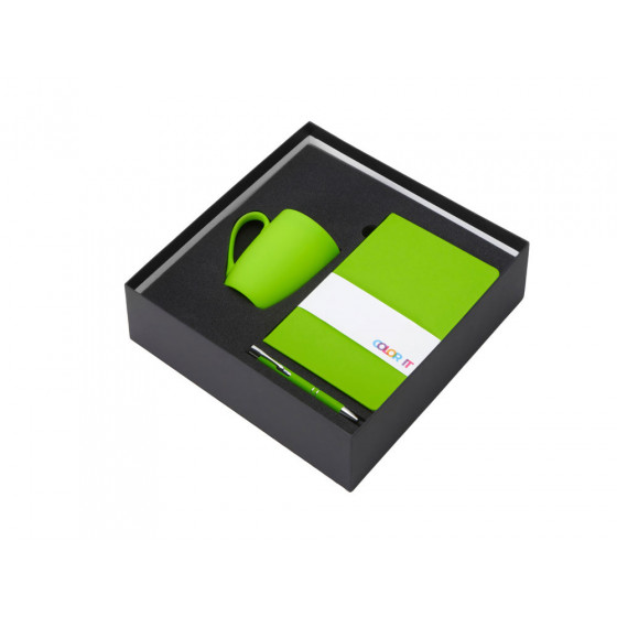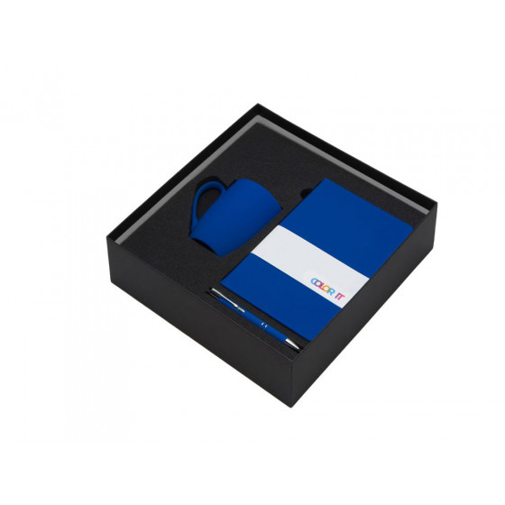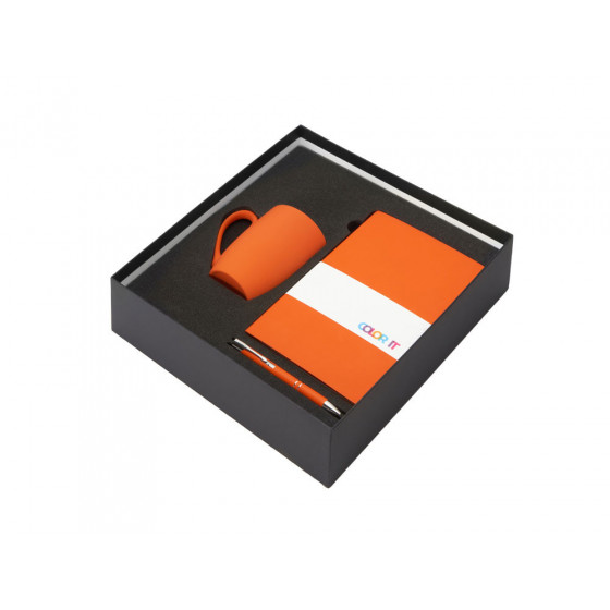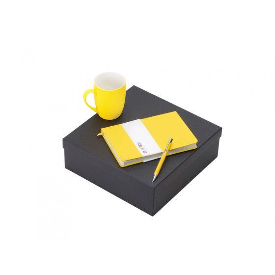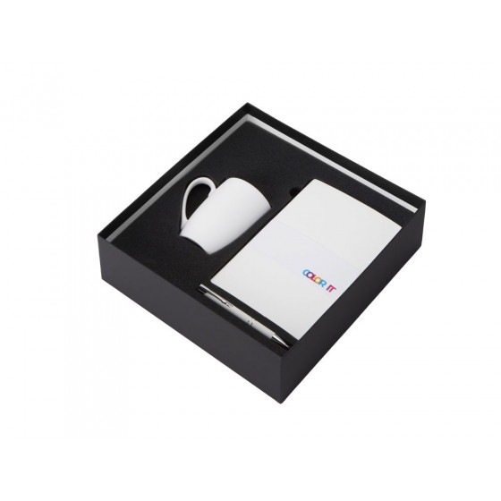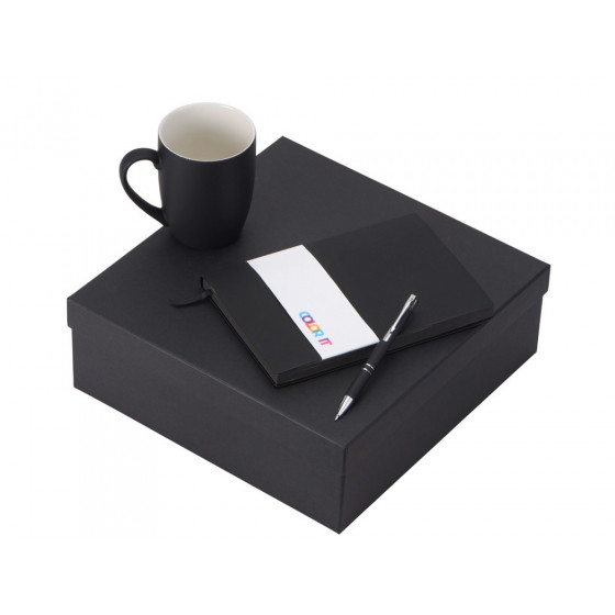 - блокнот - искусственная кожа с покрытием soft-touch, ручка - алюминий с покрытием soft-touch, кружка - фарфор с покрытием soft-touch, коробка - картон, гибкая