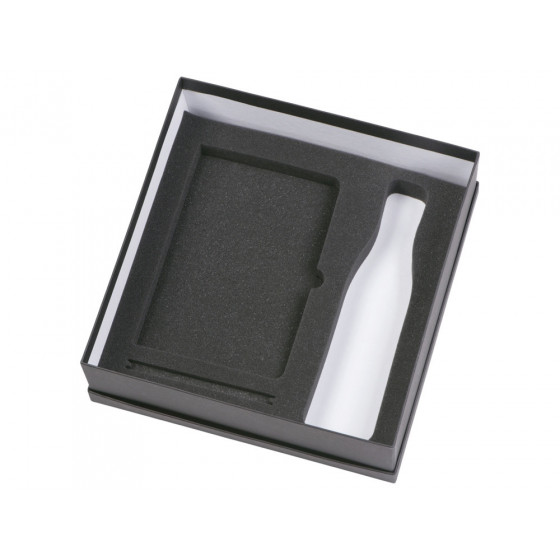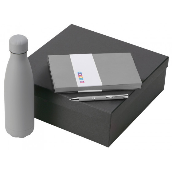 - блокнот - искусственная кожа с покрытием soft-touch, ручка - алюминий с покрытием soft-touch, термобутылка - нержавеющая cталь с покрытием soft-touch, коробка - картон, гибкая