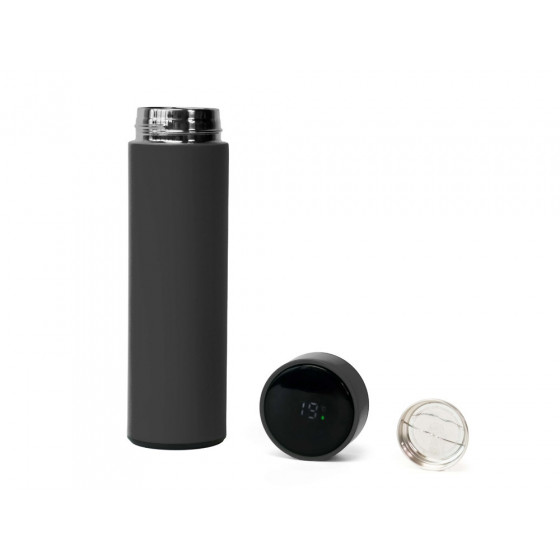 Термос выполнен из нержавеющей стали и покрыт цветным soft-touch покрытием. Его особенность — инновационная крышка со встроенным термометром и LED-дисплеем, который отображает температуру напитка внутри.