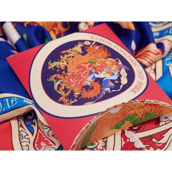 Прочитав сказку юного дарования, сам великий Александр Сергеевич Пушкин сказал: «Этот род сочинений я могу теперь оставить» - и Петр Ершов был принят в круг петербургских писателей.В этом году сказке из золотого фонда русской литературы, переведенной на все языки мира, исполняется 185 лет. Ее яркие краски мы перенесли на шелк и создали платок «Конек-Горбунок».