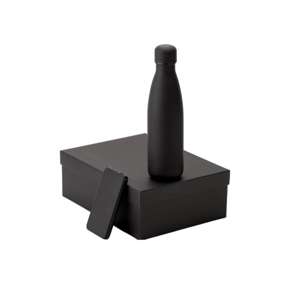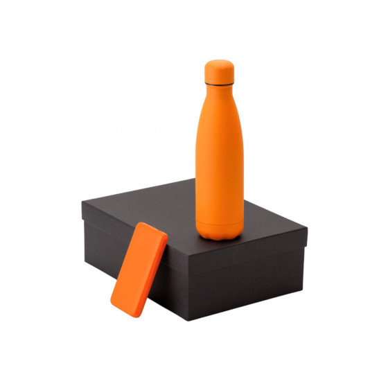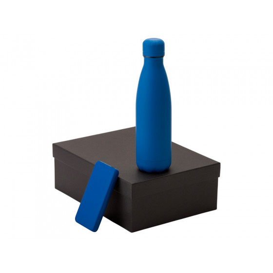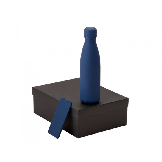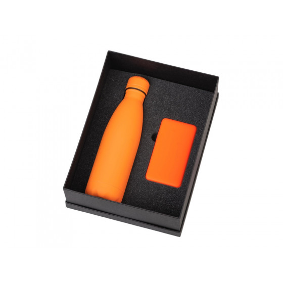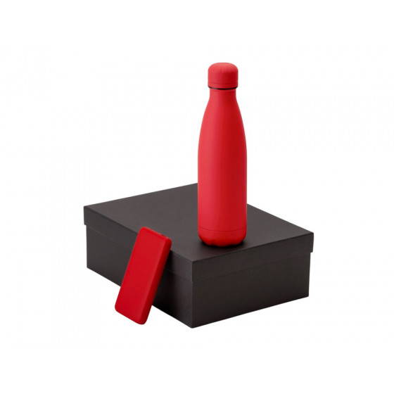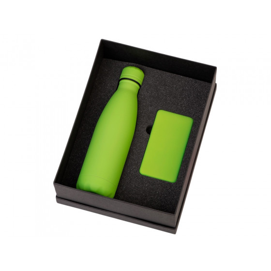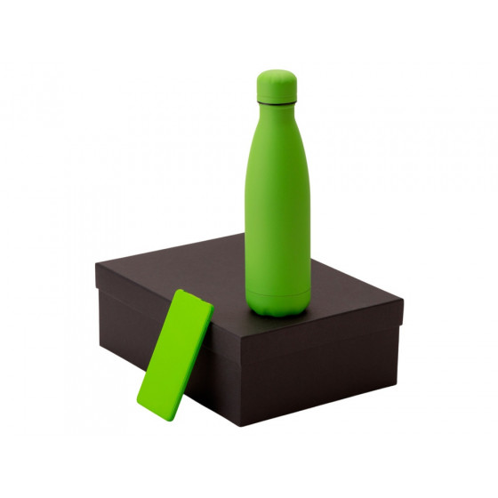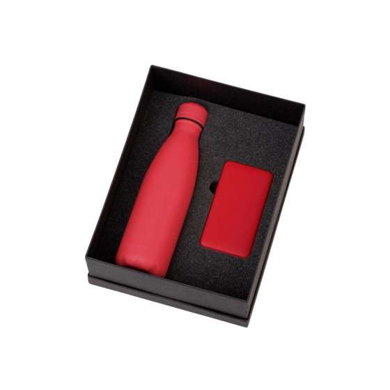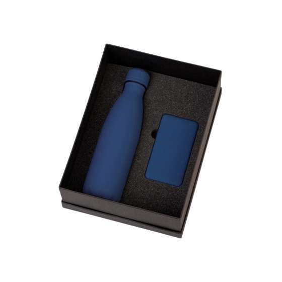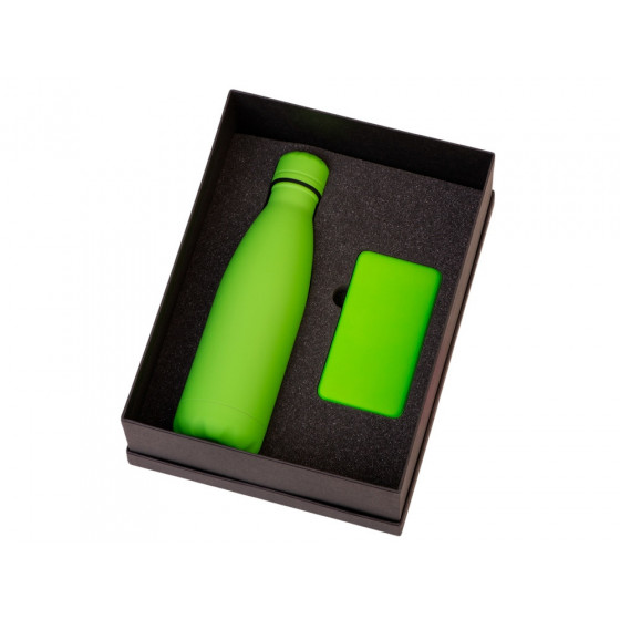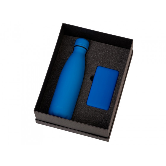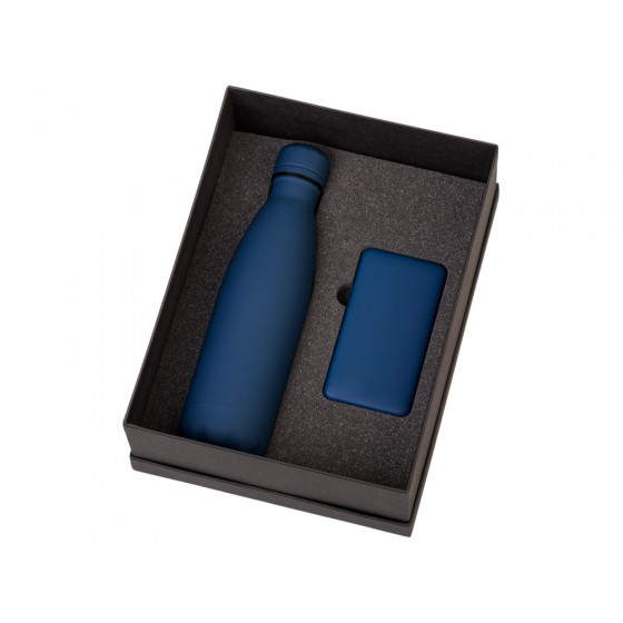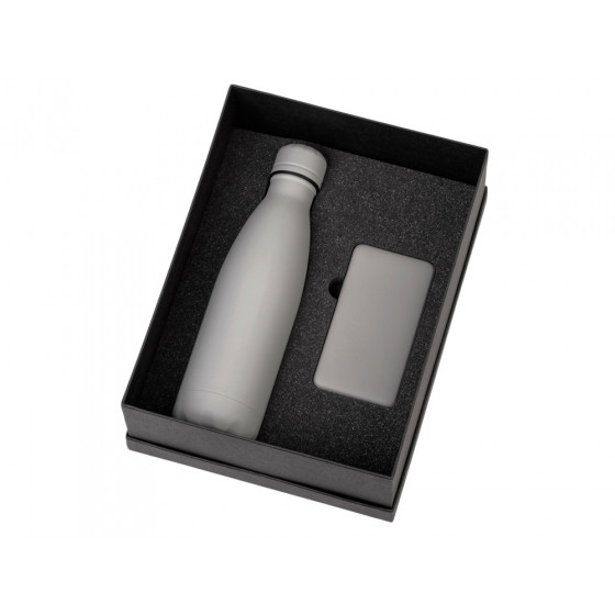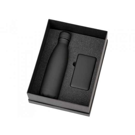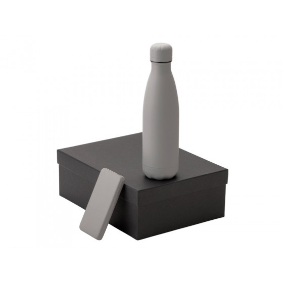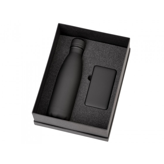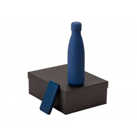 - повербанк- пластик с покрытием soft-touch, термобутылка- нержавеющая cталь с покрытием soft-touch