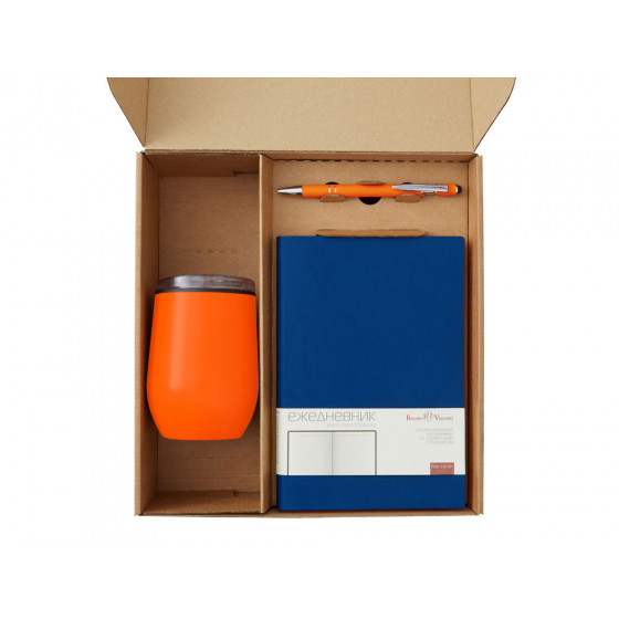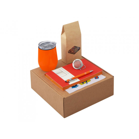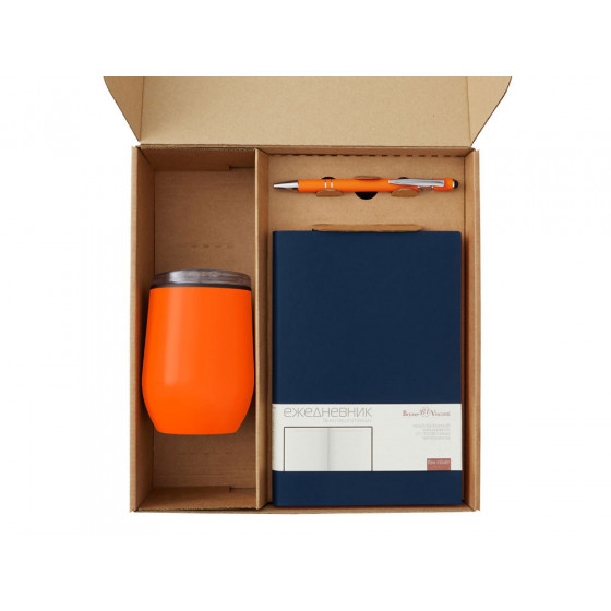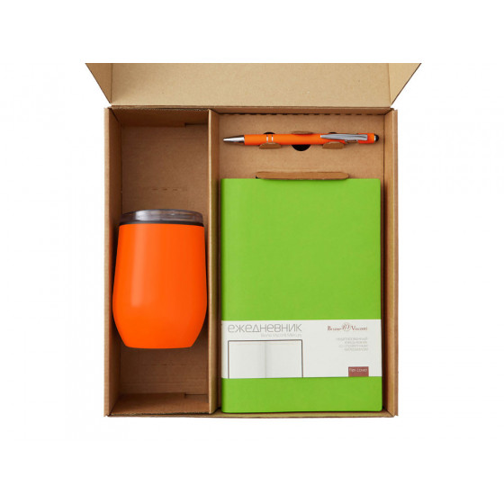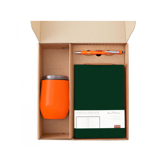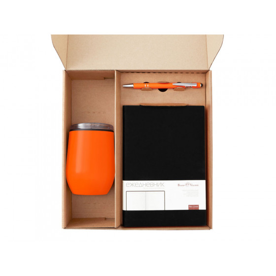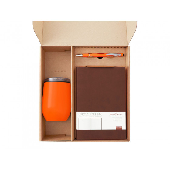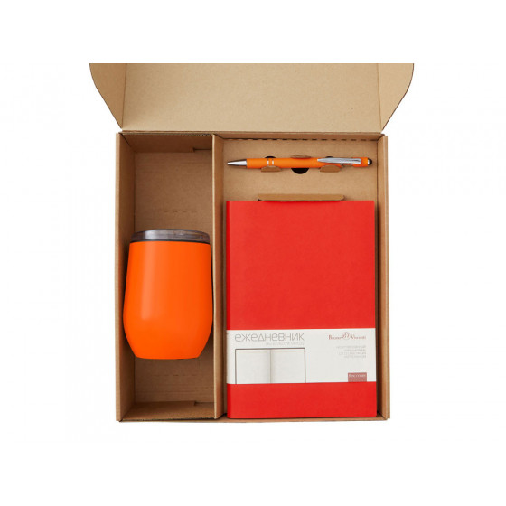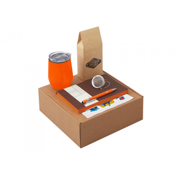 - ежедневник - искусственная кожа, термокружка - нержавеющая сталь снаружи, полипропилен внутри, ручка - металл c покрытием soft-touch, ситечко - нержавеющая cталь