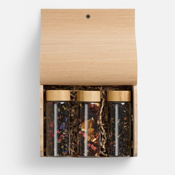 Изысканный набор из трех черных чаев в элегантной шкатулке из шпона. Мягкие древесные оттенки «Подмосковных вечеров», яркая фруктовая насыщенность «Кенийского королевского» и сладковато‑травяной букет «Малины с медом и чабрецом» создают гармоничную вкусовую композицию.В комплект входят:Чай черный «Подмосковные вечера»Состав: чай черный индийский листовой OPА Assam , ягоды красной смородины сублимированные, листья смородины, лепестки василька, цветы мальвы, кусочки шиповника, ароматизатор «черная смородина»Вес нетто: 30 гЧай черный «Кенийский королевский» Состав: чай черный кенийский листовой, цедра лимона, слайсы апельсина, манго сублимированный кусочки, кусочки ананаса, ройбуш, сафлор, ароматизатор «кокос и ананас»Вес нетто: 40 гЧай черный «Малина с медом и чабрецом»Состав: чай черный индийский листовой, малина сублимированная кусочки, листья ежевики, цветы липы, чабрец, ароматизатор «малина», ароматизатор «мед»Вес нетто: 40 гПодарочная коробка с бумажным наполнителемСрок хранения 24 месяца.