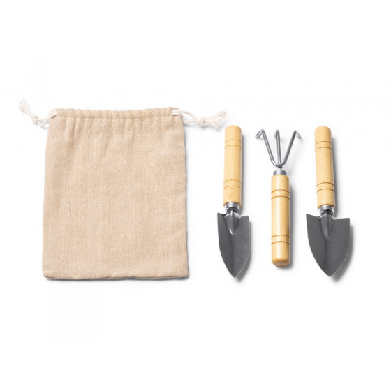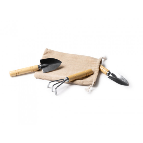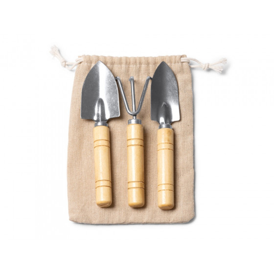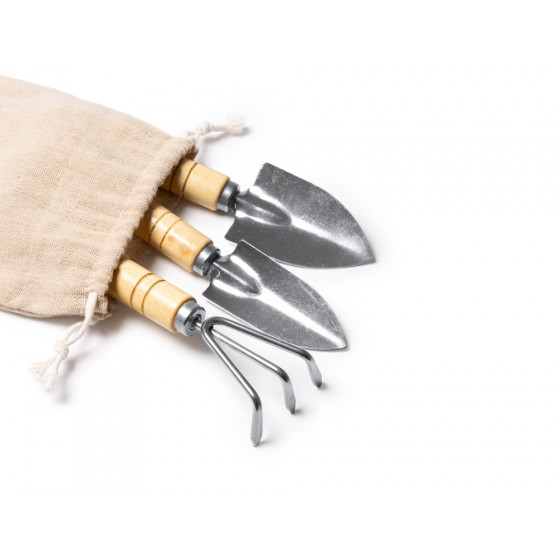 Садовый набор из 3 аксессуаров из нержавеющей стали с бамбуковыми ручками. Включает большую и малую лопатки и грабли. В комплект входит хлопковый мешочек.