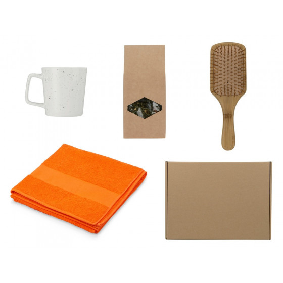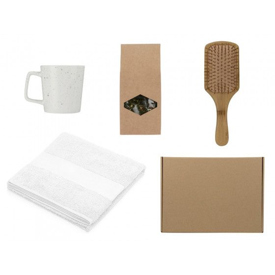- полотенце - 100% хлопок, расческа - бамбук, чай - картонная упаковка, кружка - костяной фарфор, коробка - картон