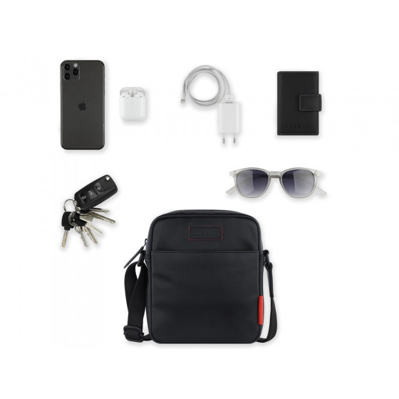 Внешняя организация: передний открытый карман, задний карман на молнии, регулируемый плечевой ремень (до 150 см), пыльник в комплекте.