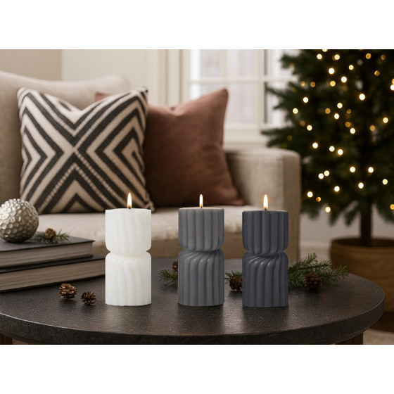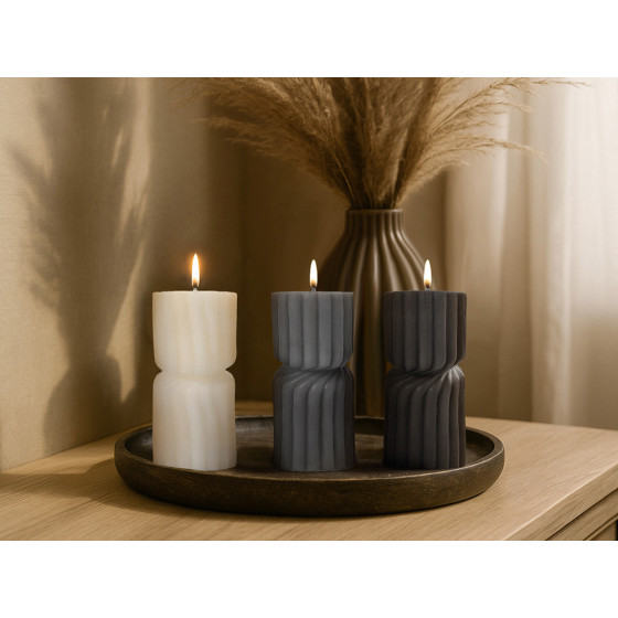 Стильные свечи с формой, вдохновлённой античной архитектурой, станут акцентом вашего интерьера и источником особого настроения. Форма: утончённые вертикальные линии и грани, создающие игру света и тени. Ароматы: - свежий бергамот с нотами ванили; - тёплый цветочный мёд; - глубокая кубинская сигара. Цвета: тёмно-серый, серый, белый — универсальное сочетание для любого интерьера. Материал: высококачественный воск для ровного и чистого горения.