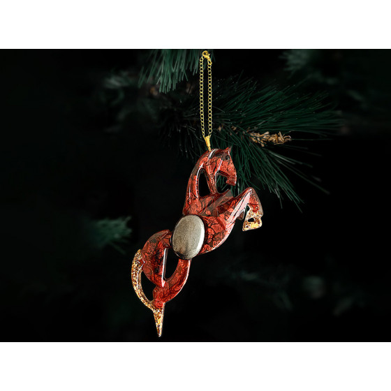 Лошадь - олицетворение свободы, силы и стремления вперёд. Фигура выполнена в динамике — будто застыла в прыжке, передавая энергию движения и благородства. Создана из ювелирной эпоксидной смолы и украшена природным камнем. Игрушка бережно упакована в картонную коробку с внутренним вкладышем, который надежно фиксирует её внутри. Для вашего удобства к игрушке прилагается цепочка или ленточка, с помощью которой вы легко сможете подвесить её на ёлку.