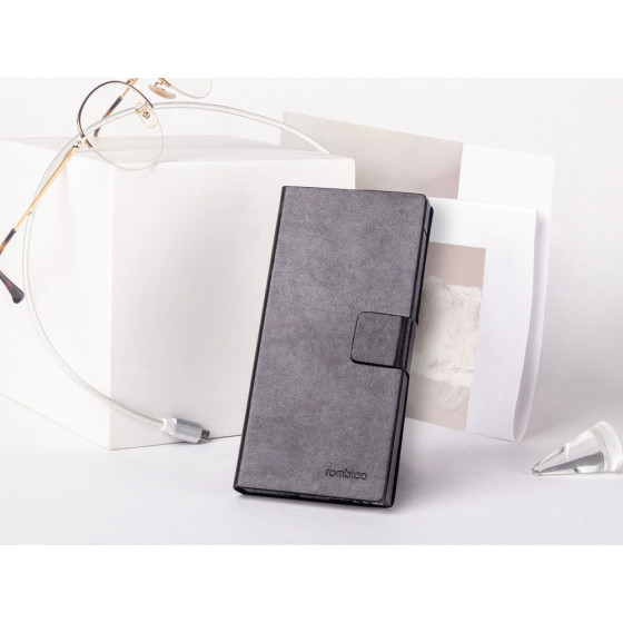 • Чехол-книжка с кожаной фактурой и карманами для банковских карт и визиток.