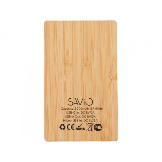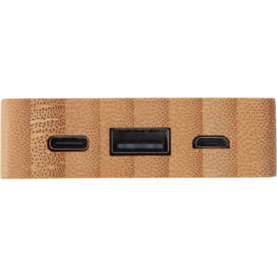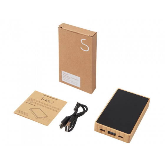 Компактный и стильный внешний аккумулятор ёмкостью 5 000 мАч — идеальный спутник для повседневных дел и коротких поездок. Его корпус сочетает в себе натуральный бамбук и переработанный ABS-пластик, что делает устройство не только более экологичным, но и визуально премиальным. Особый шарм ему придаёт встроенная панель с белой подсветкой с возможностью нанесения логотипа — ваш бренд или инициалы мягко засветятся в темноте, привлекая внимание и подчеркивая индивидуальность. Это не просто power bank — это экосознательный аксессуар, который заряжает ваши гаджеты и вдохновляет окружающих.