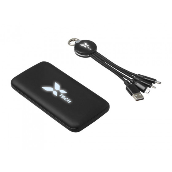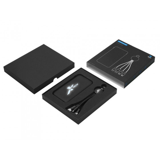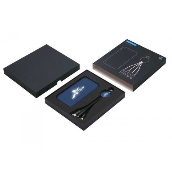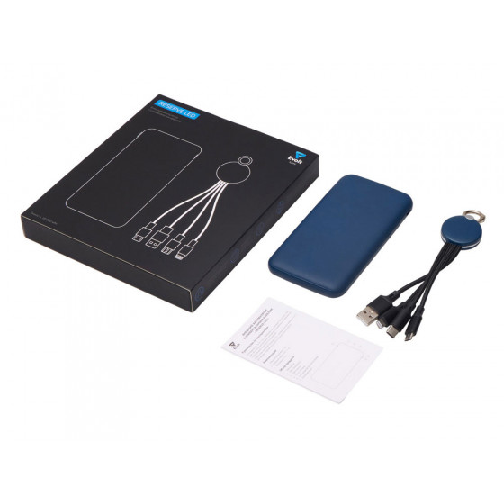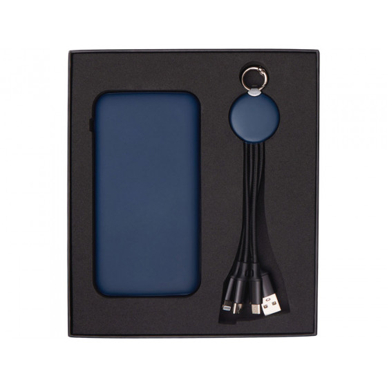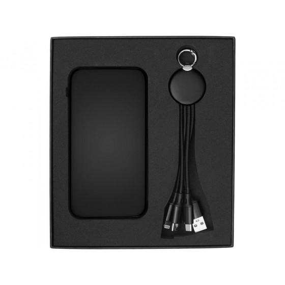 Практичный и стильный набор для зарядки в дороге: внешний аккумулятор на 10 000 мА·ч и универсальный кабель с тремя разъёмами (Micro USB, Lightning, USB Type-C). Оба элемента комплекта оснащены подсветкой логотипа — ваш бренд всегда на виду, даже в темноте. Повербанк обеспечивает 2–3 полных заряда смартфона и оснащён двумя выходами (USB-A и USB-C) для одновременной зарядки двух устройств. Поставляется в прочной подарочной коробке с шубером — идеальное решение для корпоративных подарков.