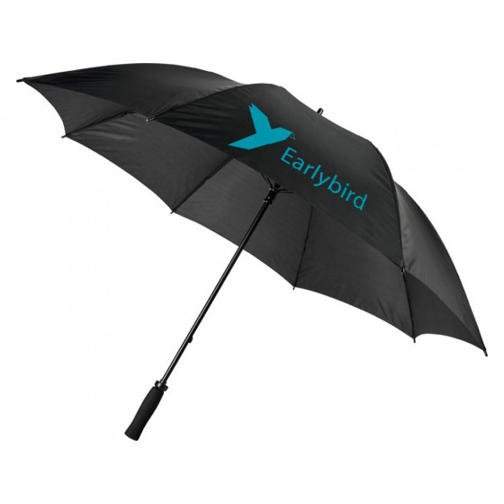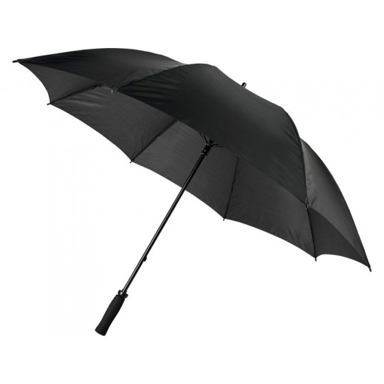 Зонт с кнопкой автоматического открытия размера XL с ручкой, стержнем и наконечниками черного цвета. Длинные стекловолоконные спицы. Ручка из EVA. 130 см в диаметре.